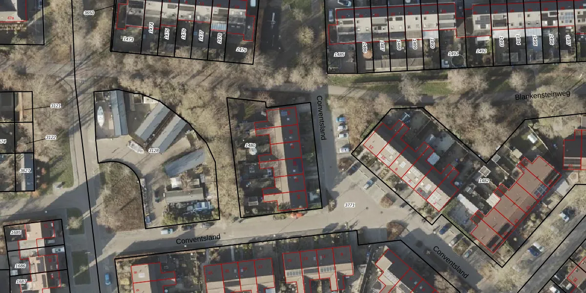 Het perceel waarop Conventsland 18 staat heeft een oppervlakte van 1065 m². Dit is een zeer groot perceel. De perceeloppervlakte wordt geregistreerd door het Kadaster. Gedetailleerde informatie over de maten van dit perceel kunt u vinden in het rapport Kadastrale kaart met maatvoering van Conventsland 18.