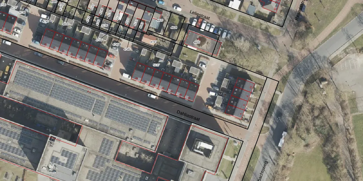 Het perceel waarop Dahliastraat 39 staat heeft een oppervlakte van 4901 m². Dit is een zeer groot perceel. De perceeloppervlakte wordt geregistreerd door het Kadaster. Gedetailleerde informatie over de maten van dit perceel kunt u vinden in het rapport Kadastrale kaart met maatvoering van Dahliastraat 39.
