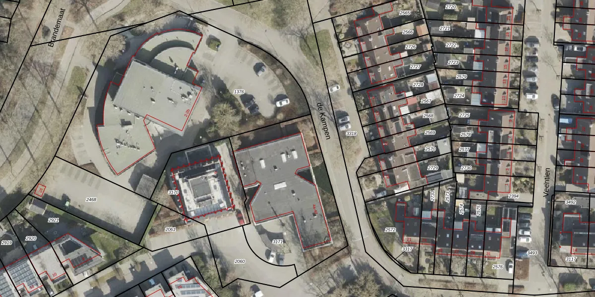 Het perceel waarop de Kampen 4-B staat heeft een oppervlakte van 1414 m². Dit is een zeer groot perceel. De perceeloppervlakte wordt geregistreerd door het Kadaster. Gedetailleerde informatie over de maten van dit perceel kunt u vinden in het rapport Kadastrale kaart met maatvoering van de Kampen 4-B.