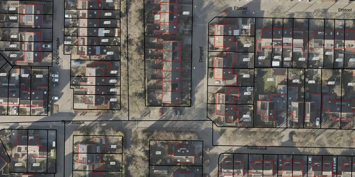 Het perceel waarop Dingspil 36 staat heeft een oppervlakte van 3391 m². Dit is een zeer groot perceel. De perceeloppervlakte wordt geregistreerd door het Kadaster. Gedetailleerde informatie over de maten van dit perceel kunt u vinden in het rapport Kadastrale kaart met maatvoering van Dingspil 36.