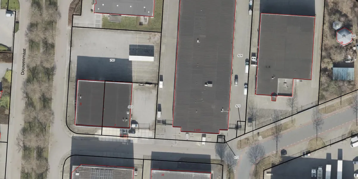 Het perceel waarop Douwenmaat 1-6 staat heeft een oppervlakte van 6403 m². Dit is een zeer groot perceel. De perceeloppervlakte wordt geregistreerd door het Kadaster. Gedetailleerde informatie over de maten van dit perceel kunt u vinden in het rapport Kadastrale kaart met maatvoering van Douwenmaat 1-6.