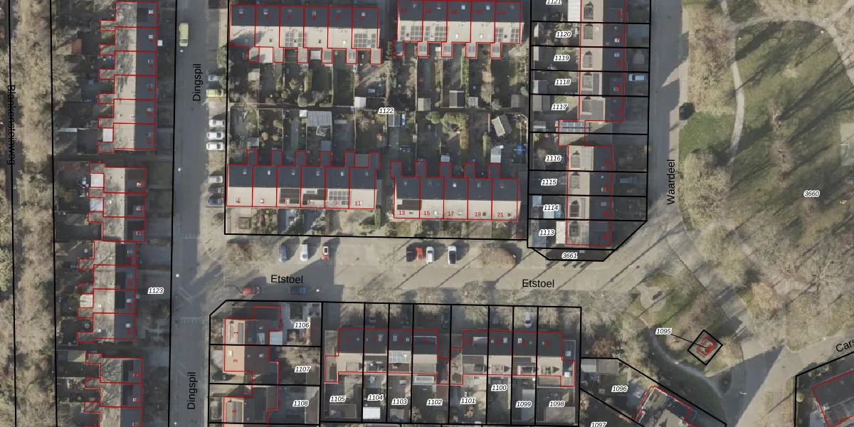 Het perceel waarop Etstoel 15 staat heeft een oppervlakte van 4264 m². Dit is een zeer groot perceel. De perceeloppervlakte wordt geregistreerd door het Kadaster. Gedetailleerde informatie over de maten van dit perceel kunt u vinden in het rapport Kadastrale kaart met maatvoering van Etstoel 15.