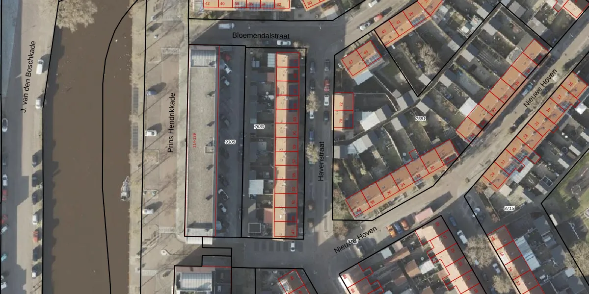 Het perceel waarop Havenstraat 59 staat heeft een oppervlakte van 1300 m². Dit is een zeer groot perceel. De perceeloppervlakte wordt geregistreerd door het Kadaster. Gedetailleerde informatie over de maten van dit perceel kunt u vinden in het rapport Kadastrale kaart met maatvoering van Havenstraat 59.
