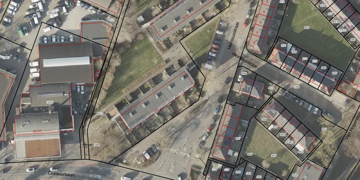 Het perceel waarop Heinsiusstraat 27 staat heeft een oppervlakte van 1,2 ha. Dit is een zeer groot perceel. De perceeloppervlakte wordt geregistreerd door het Kadaster. Gedetailleerde informatie over de maten van dit perceel kunt u vinden in het rapport Kadastrale kaart met maatvoering van Heinsiusstraat 27.