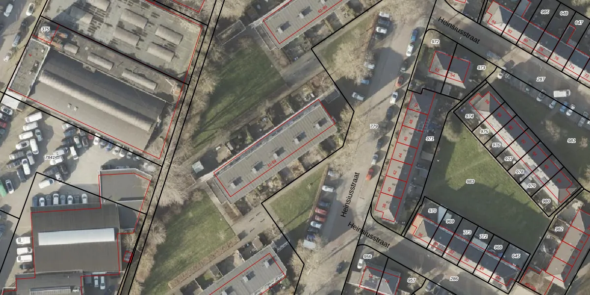 Het perceel waarop Heinsiusstraat 33 staat heeft een oppervlakte van 1,2 ha. Dit is een zeer groot perceel. De perceeloppervlakte wordt geregistreerd door het Kadaster. Gedetailleerde informatie over de maten van dit perceel kunt u vinden in het rapport Kadastrale kaart met maatvoering van Heinsiusstraat 33.