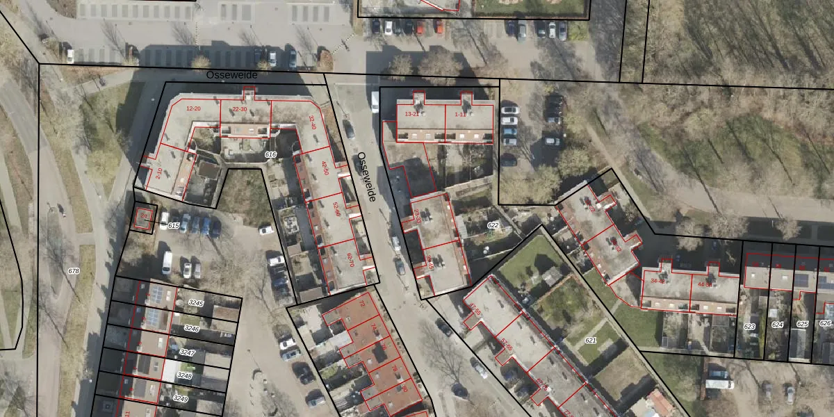 Het perceel waarop Osseweide 23 staat heeft een oppervlakte van 2549 m². Dit is een zeer groot perceel. De perceeloppervlakte wordt geregistreerd door het Kadaster. Gedetailleerde informatie over de maten van dit perceel kunt u vinden in het rapport Kadastrale kaart met maatvoering van Osseweide 23.