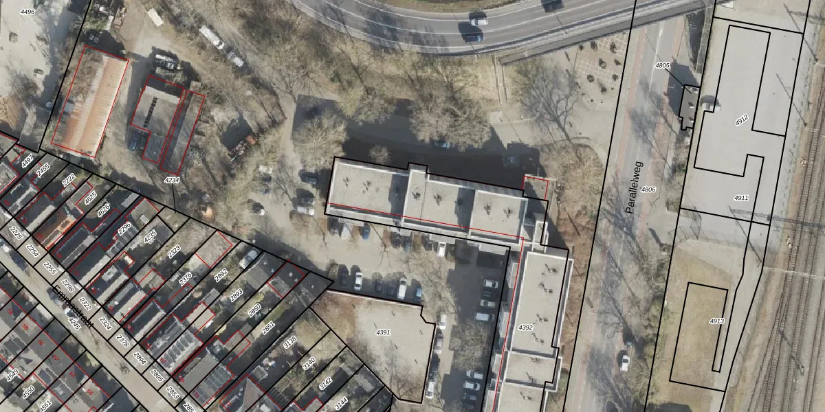 Het perceel waarop Parallelweg 20-42 staat heeft een oppervlakte van 1565 m². Dit is een zeer groot perceel. De perceeloppervlakte wordt geregistreerd door het Kadaster. Gedetailleerde informatie over de maten van dit perceel kunt u vinden in het rapport Kadastrale kaart met maatvoering van Parallelweg 20-42.