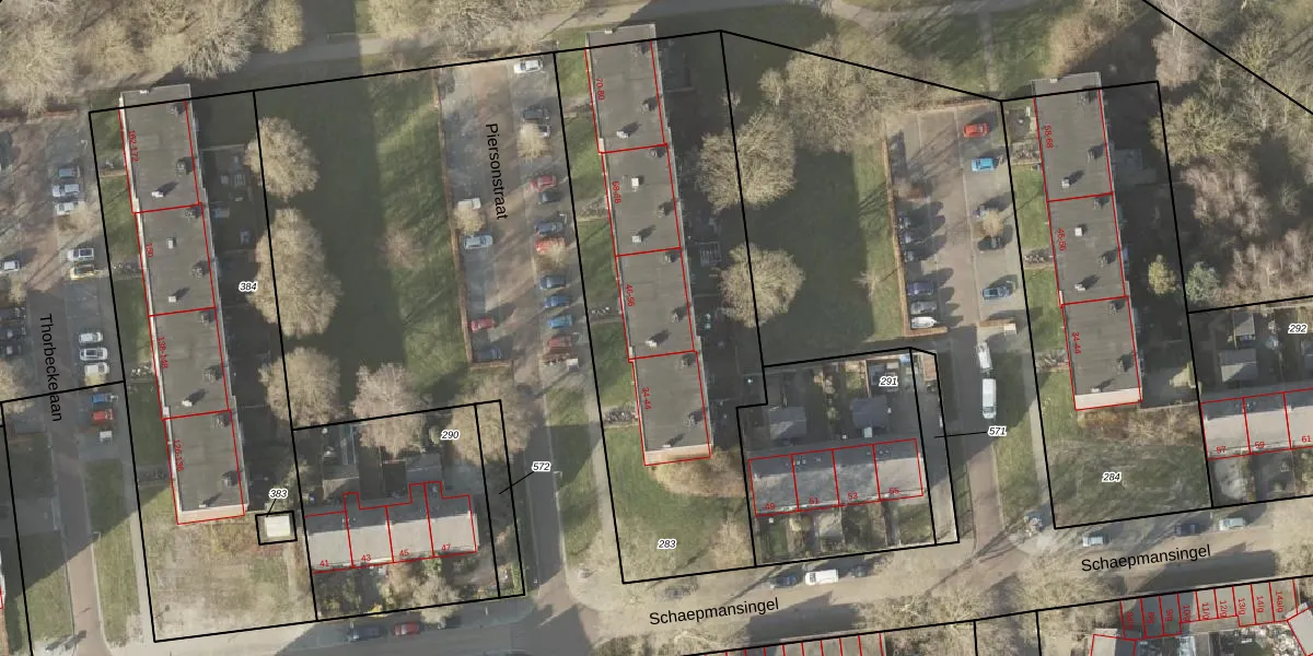 Het perceel waarop Piersonstraat 54 staat heeft een oppervlakte van 1988 m². Dit is een zeer groot perceel. De perceeloppervlakte wordt geregistreerd door het Kadaster. Gedetailleerde informatie over de maten van dit perceel kunt u vinden in het rapport Kadastrale kaart met maatvoering van Piersonstraat 54.