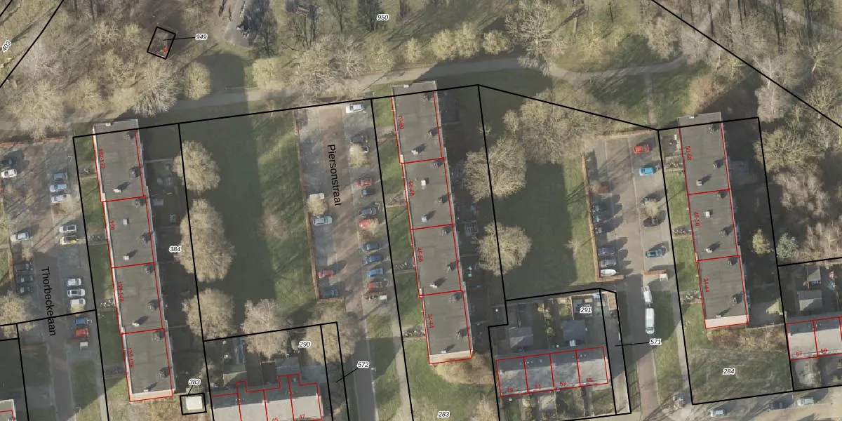 Het perceel waarop Piersonstraat 62 staat heeft een oppervlakte van 1988 m². Dit is een zeer groot perceel. De perceeloppervlakte wordt geregistreerd door het Kadaster. Gedetailleerde informatie over de maten van dit perceel kunt u vinden in het rapport Kadastrale kaart met maatvoering van Piersonstraat 62.