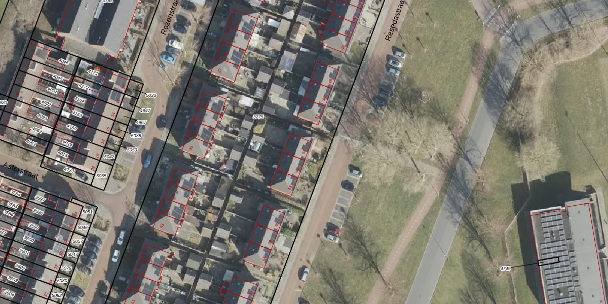 Het perceel waarop Resedastraat 54 staat heeft een oppervlakte van 1,1 ha. Dit is een zeer groot perceel. De perceeloppervlakte wordt geregistreerd door het Kadaster. Gedetailleerde informatie over de maten van dit perceel kunt u vinden in het rapport Kadastrale kaart met maatvoering van Resedastraat 54.