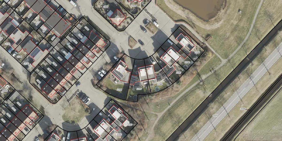 Roerdomp 44 is gelegen op kadastraal perceel MPL00M2295. Deze kadastrale aanduiding is uniek en wordt gebruikt door het Kadaster om eigendomsrechten en andere zakelijke rechten vast te leggen. Het perceel maakt onderdeel uit van de kadastrale gemeente Meppel.
