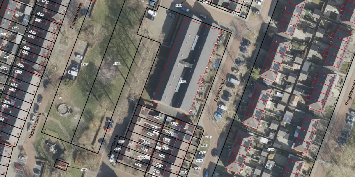 Het perceel waarop Rozenstraat 8-A-14 staat heeft een oppervlakte van 2243 m². Dit is een zeer groot perceel. De perceeloppervlakte wordt geregistreerd door het Kadaster. Gedetailleerde informatie over de maten van dit perceel kunt u vinden in het rapport Kadastrale kaart met maatvoering van Rozenstraat 8-A-14.