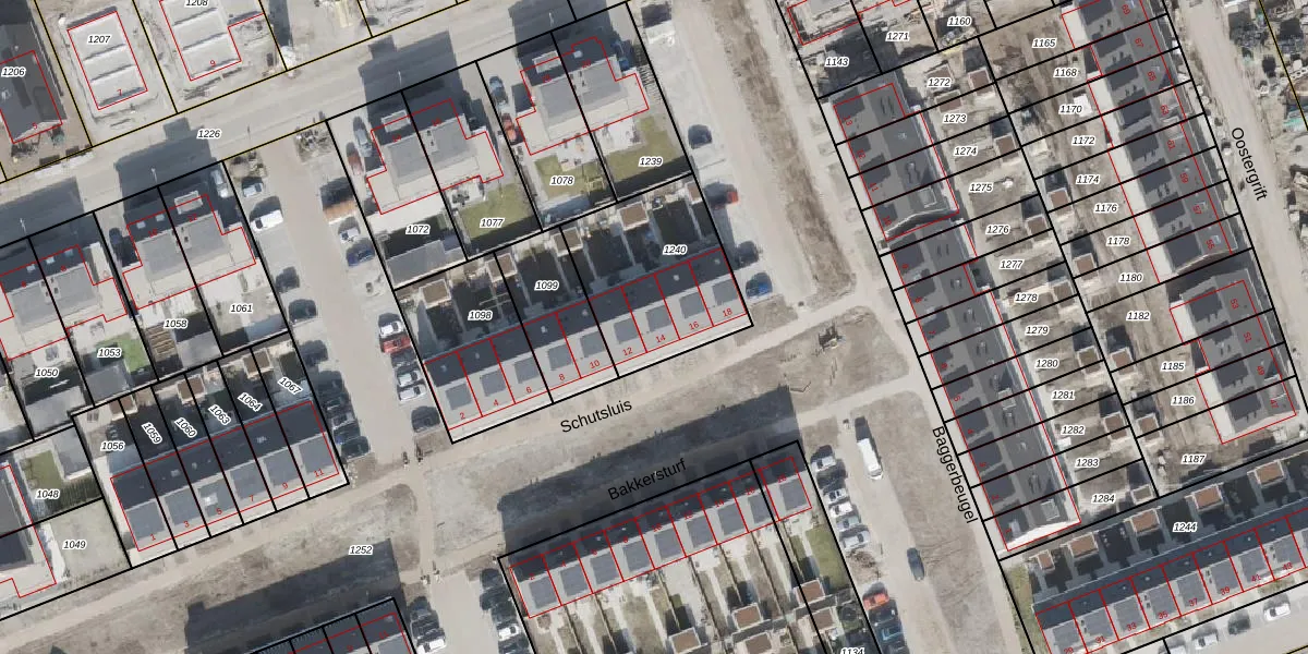 Het perceel waarop Schutsluis 14 staat heeft een oppervlakte van 551 m². Dit is een groot perceel. De perceeloppervlakte wordt geregistreerd door het Kadaster. Gedetailleerde informatie over de maten van dit perceel kunt u vinden in het rapport Kadastrale kaart met maatvoering van Schutsluis 14.