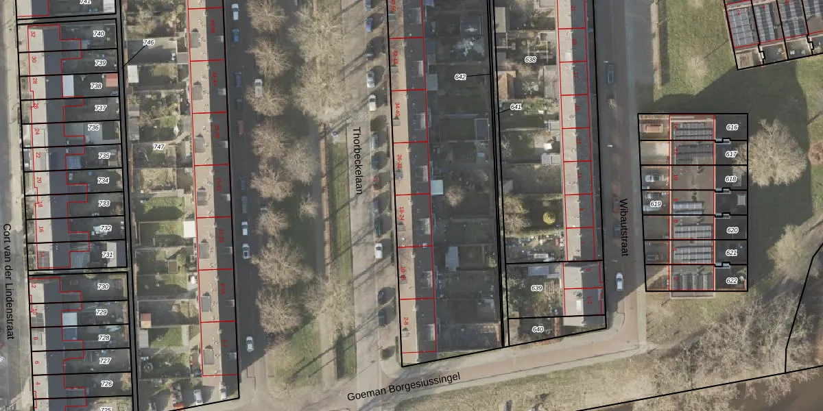 Het perceel waarop Thorbeckelaan 24 staat heeft een oppervlakte van 4025 m². Dit is een zeer groot perceel. De perceeloppervlakte wordt geregistreerd door het Kadaster. Gedetailleerde informatie over de maten van dit perceel kunt u vinden in het rapport Kadastrale kaart met maatvoering van Thorbeckelaan 24.