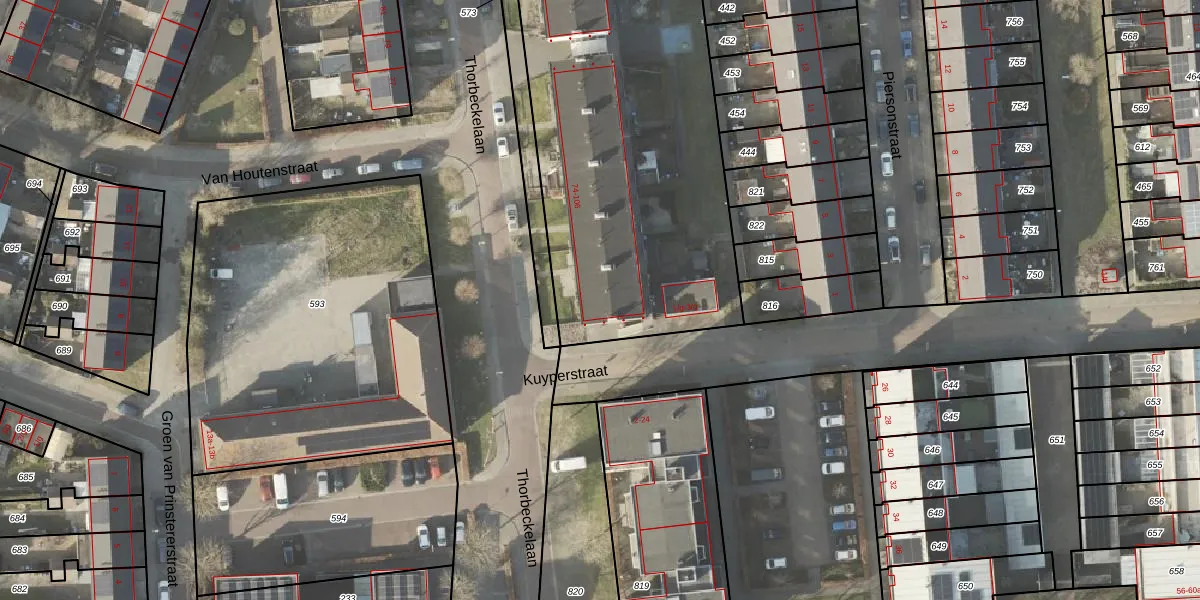 Het perceel waarop Thorbeckelaan 88 staat heeft een oppervlakte van 3440 m². Dit is een zeer groot perceel. De perceeloppervlakte wordt geregistreerd door het Kadaster. Gedetailleerde informatie over de maten van dit perceel kunt u vinden in het rapport Kadastrale kaart met maatvoering van Thorbeckelaan 88.
