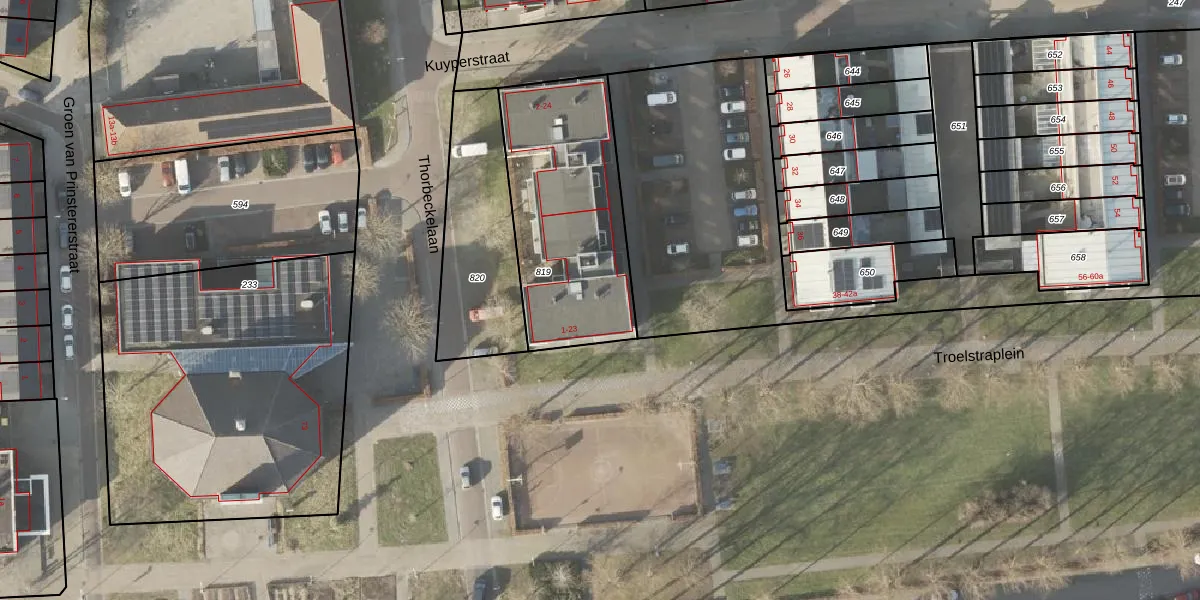 Het perceel waarop Troelstraplein 21 staat heeft een oppervlakte van 810 m². Dit is een groot perceel. De perceeloppervlakte wordt geregistreerd door het Kadaster. Gedetailleerde informatie over de maten van dit perceel kunt u vinden in het rapport Kadastrale kaart met maatvoering van Troelstraplein 21.