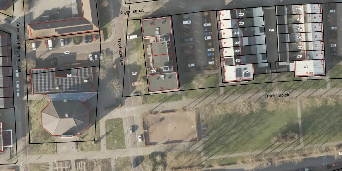 Het perceel waarop Troelstraplein 9 staat heeft een oppervlakte van 810 m². Dit is een groot perceel. De perceeloppervlakte wordt geregistreerd door het Kadaster. Gedetailleerde informatie over de maten van dit perceel kunt u vinden in het rapport Kadastrale kaart met maatvoering van Troelstraplein 9.