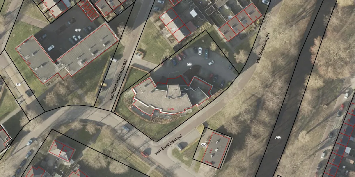 Het perceel waarop van Ewijcksingel 1-06 staat heeft een oppervlakte van 2219 m². Dit is een zeer groot perceel. De perceeloppervlakte wordt geregistreerd door het Kadaster. Gedetailleerde informatie over de maten van dit perceel kunt u vinden in het rapport Kadastrale kaart met maatvoering van van Ewijcksingel 1-06.
