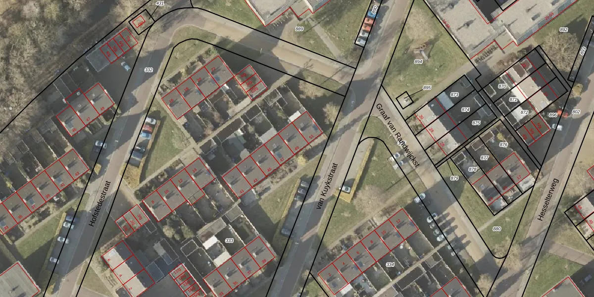 Het perceel waarop van Kuykstraat 49 staat heeft een oppervlakte van 7609 m². Dit is een zeer groot perceel. De perceeloppervlakte wordt geregistreerd door het Kadaster. Gedetailleerde informatie over de maten van dit perceel kunt u vinden in het rapport Kadastrale kaart met maatvoering van van Kuykstraat 49.