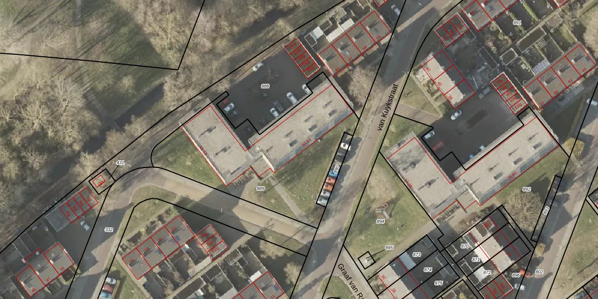 Het perceel waarop van Kuykstraat 55 staat heeft een oppervlakte van 1759 m². Dit is een zeer groot perceel. De perceeloppervlakte wordt geregistreerd door het Kadaster. Gedetailleerde informatie over de maten van dit perceel kunt u vinden in het rapport Kadastrale kaart met maatvoering van van Kuykstraat 55.