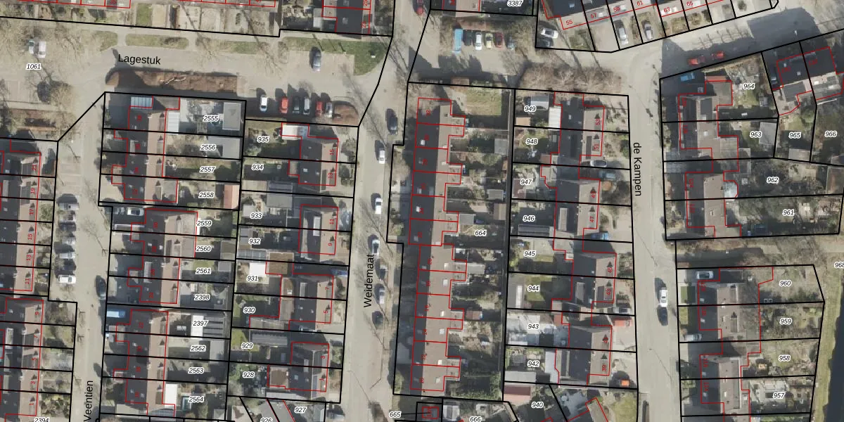 Het perceel waarop Weidemaat 24 staat heeft een oppervlakte van 1966 m². Dit is een zeer groot perceel. De perceeloppervlakte wordt geregistreerd door het Kadaster. Gedetailleerde informatie over de maten van dit perceel kunt u vinden in het rapport Kadastrale kaart met maatvoering van Weidemaat 24.