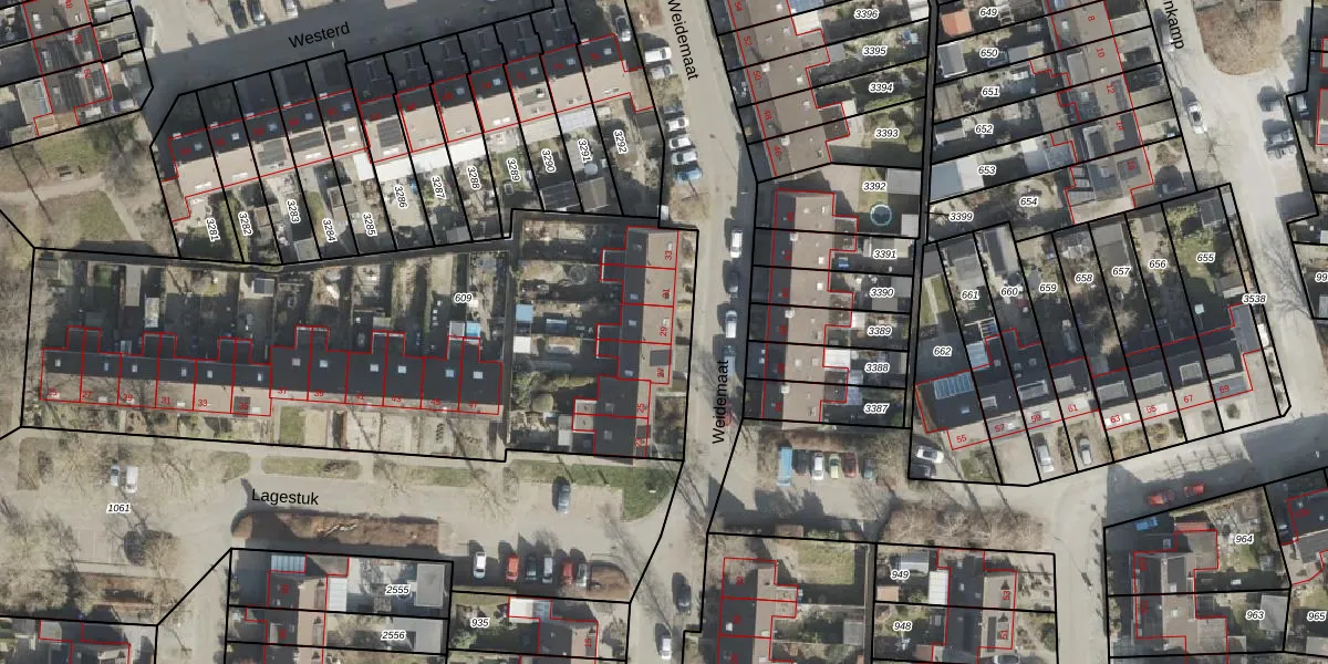 Het perceel waarop Weidemaat 29 staat heeft een oppervlakte van 3064 m². Dit is een zeer groot perceel. De perceeloppervlakte wordt geregistreerd door het Kadaster. Gedetailleerde informatie over de maten van dit perceel kunt u vinden in het rapport Kadastrale kaart met maatvoering van Weidemaat 29.