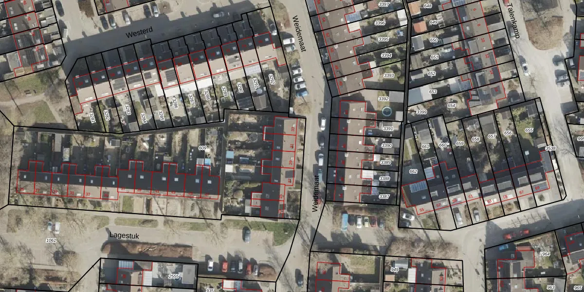 Het perceel waarop Weidemaat 31 staat heeft een oppervlakte van 3064 m². Dit is een zeer groot perceel. De perceeloppervlakte wordt geregistreerd door het Kadaster. Gedetailleerde informatie over de maten van dit perceel kunt u vinden in het rapport Kadastrale kaart met maatvoering van Weidemaat 31.