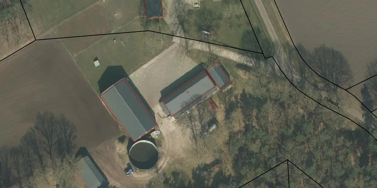 Het perceel waarop Daland 7-A staat heeft een oppervlakte van 3,1 ha. Dit is een zeer groot perceel. De perceeloppervlakte wordt geregistreerd door het Kadaster. Gedetailleerde informatie over de maten van dit perceel kunt u vinden in het rapport Kadastrale kaart met maatvoering van Daland 7-A.