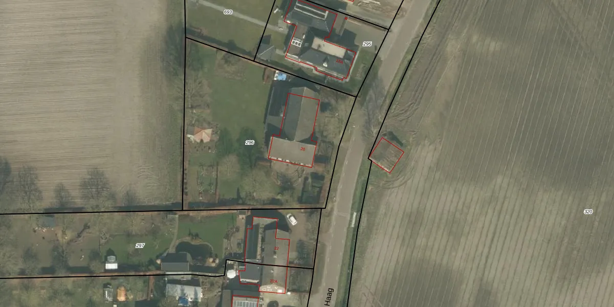 Het perceel waarop Haag 20 staat heeft een oppervlakte van 2396 m². Dit is een zeer groot perceel. De perceeloppervlakte wordt geregistreerd door het Kadaster. Gedetailleerde informatie over de maten van dit perceel kunt u vinden in het rapport Kadastrale kaart met maatvoering van Haag 20.