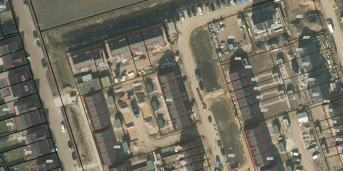 Het perceel waarop Maalderij 25 staat heeft een oppervlakte van 767 m². Dit is een groot perceel. De perceeloppervlakte wordt geregistreerd door het Kadaster. Gedetailleerde informatie over de maten van dit perceel kunt u vinden in het rapport Kadastrale kaart met maatvoering van Maalderij 25.