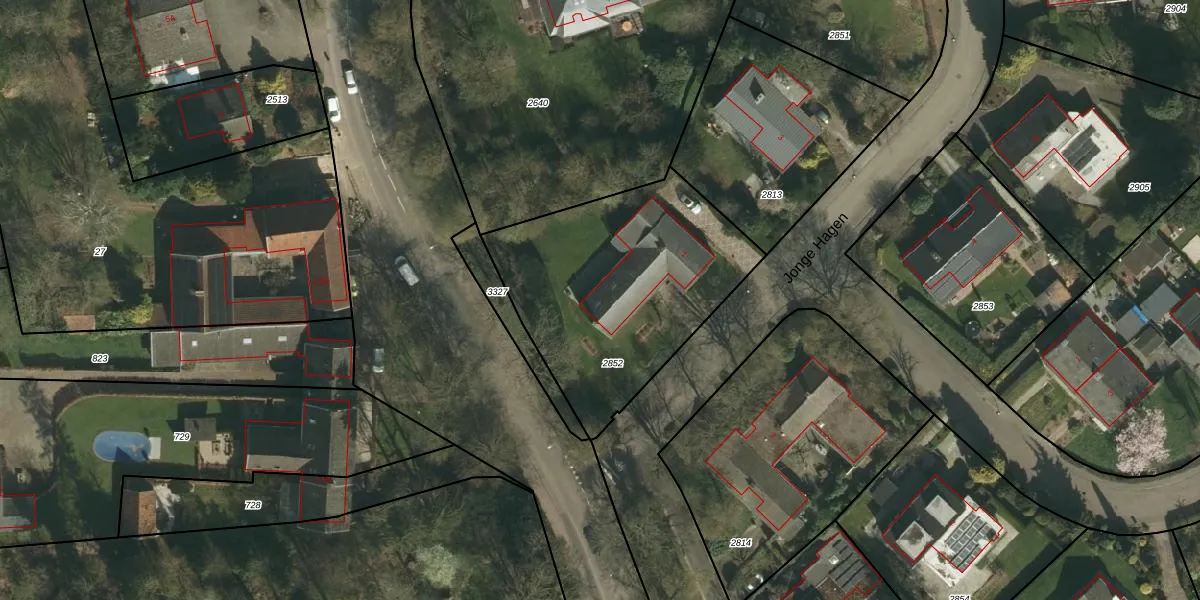 Het perceel waarop Jonge Hagen 1 staat heeft een oppervlakte van 1107 m². Dit is een zeer groot perceel. De perceeloppervlakte wordt geregistreerd door het Kadaster. Gedetailleerde informatie over de maten van dit perceel kunt u vinden in het rapport Kadastrale kaart met maatvoering van Jonge Hagen 1.