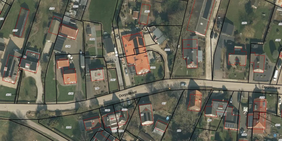 Het perceel waarop Dorpsstraat 57 staat heeft een oppervlakte van 644 m². Dit is een groot perceel. De perceeloppervlakte wordt geregistreerd door het Kadaster. Gedetailleerde informatie over de maten van dit perceel kunt u vinden in het rapport Kadastrale kaart met maatvoering van Dorpsstraat 57.