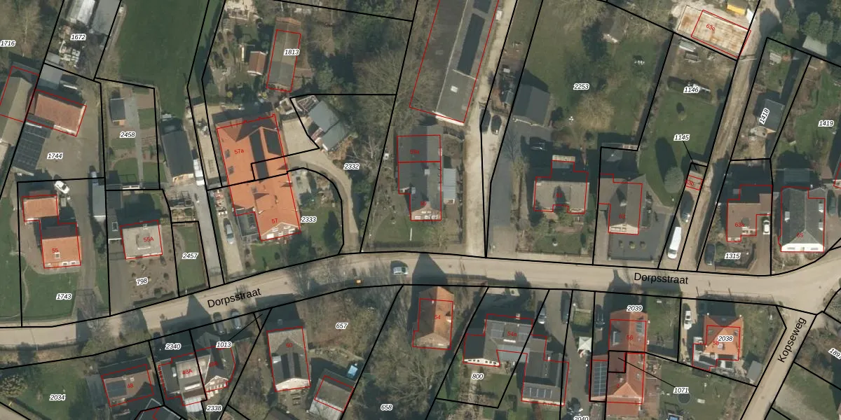 Het perceel waarop Dorpsstraat 59 staat heeft een oppervlakte van 2060 m². Dit is een zeer groot perceel. De perceeloppervlakte wordt geregistreerd door het Kadaster. Gedetailleerde informatie over de maten van dit perceel kunt u vinden in het rapport Kadastrale kaart met maatvoering van Dorpsstraat 59.