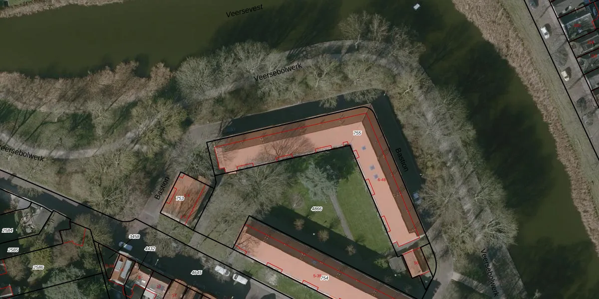 Het perceel waarop Bastion 24 staat heeft een oppervlakte van 1185 m². Dit is een zeer groot perceel. De perceeloppervlakte wordt geregistreerd door het Kadaster. Gedetailleerde informatie over de maten van dit perceel kunt u vinden in het rapport Kadastrale kaart met maatvoering van Bastion 24.