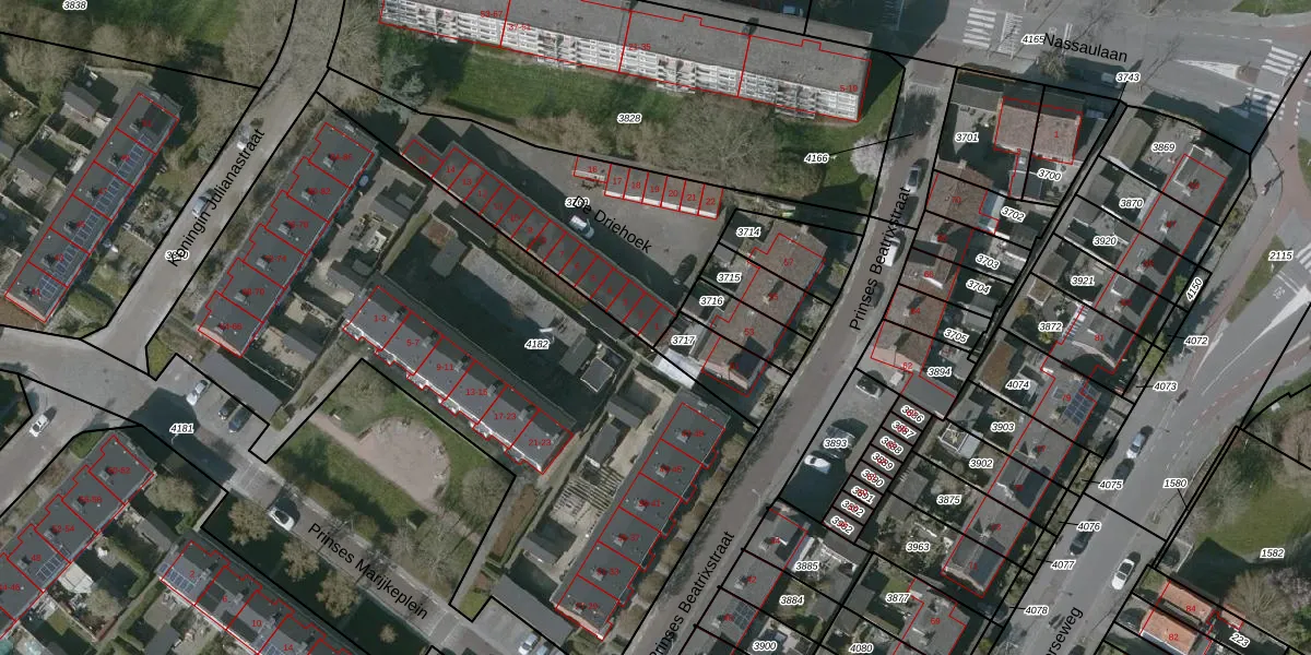 Het perceel waarop De Driehoek 1 staat heeft een oppervlakte van 992 m². Dit is een groot perceel. De perceeloppervlakte wordt geregistreerd door het Kadaster. Gedetailleerde informatie over de maten van dit perceel kunt u vinden in het rapport Kadastrale kaart met maatvoering van De Driehoek 1.