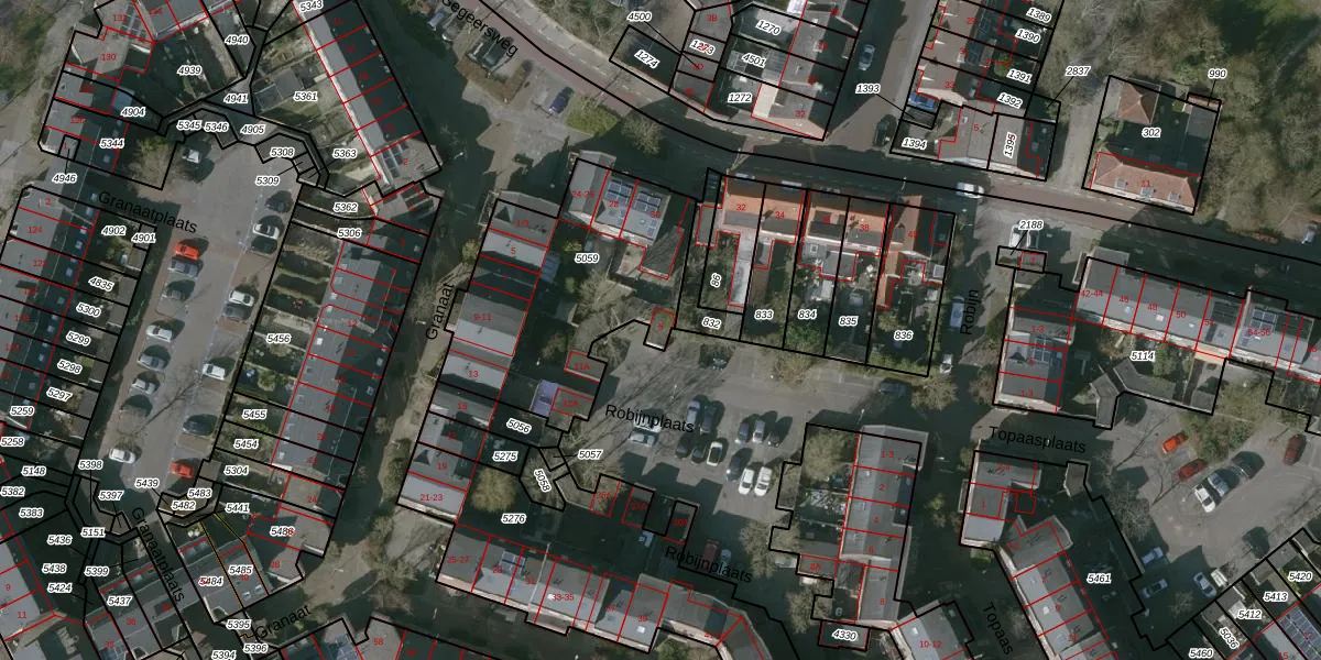 Het perceel waarop Robijnplaats 5 staat heeft een oppervlakte van 963 m². Dit is een groot perceel. De perceeloppervlakte wordt geregistreerd door het Kadaster. Gedetailleerde informatie over de maten van dit perceel kunt u vinden in het rapport Kadastrale kaart met maatvoering van Robijnplaats 5.