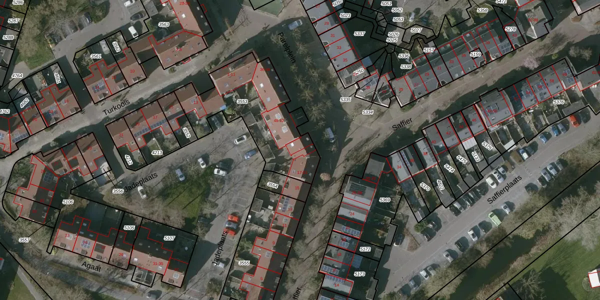 Het perceel waarop Saffier 21 staat heeft een oppervlakte van 960 m². Dit is een groot perceel. De perceeloppervlakte wordt geregistreerd door het Kadaster. Gedetailleerde informatie over de maten van dit perceel kunt u vinden in het rapport Kadastrale kaart met maatvoering van Saffier 21.