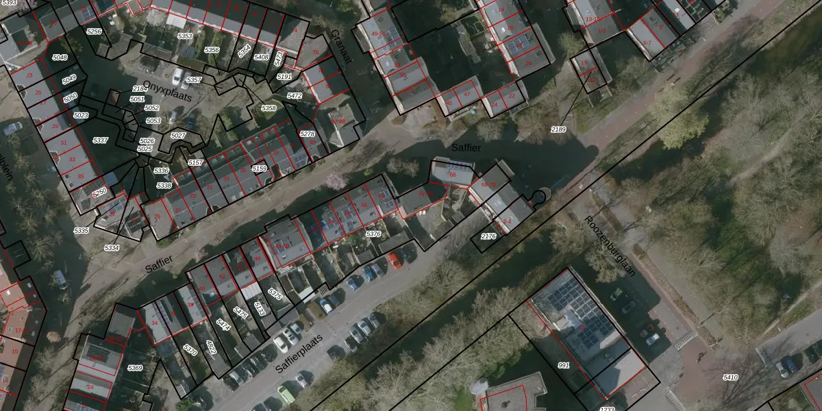 Het perceel waarop Saffier 62 staat heeft een oppervlakte van 930 m². Dit is een groot perceel. De perceeloppervlakte wordt geregistreerd door het Kadaster. Gedetailleerde informatie over de maten van dit perceel kunt u vinden in het rapport Kadastrale kaart met maatvoering van Saffier 62.