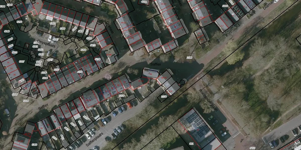 Het perceel waarop Saffier 66 staat heeft een oppervlakte van 930 m². Dit is een groot perceel. De perceeloppervlakte wordt geregistreerd door het Kadaster. Gedetailleerde informatie over de maten van dit perceel kunt u vinden in het rapport Kadastrale kaart met maatvoering van Saffier 66.