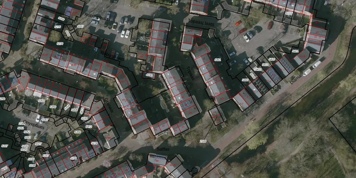 Het perceel waarop Topaas 14 staat heeft een oppervlakte van 2469 m². Dit is een zeer groot perceel. De perceeloppervlakte wordt geregistreerd door het Kadaster. Gedetailleerde informatie over de maten van dit perceel kunt u vinden in het rapport Kadastrale kaart met maatvoering van Topaas 14.