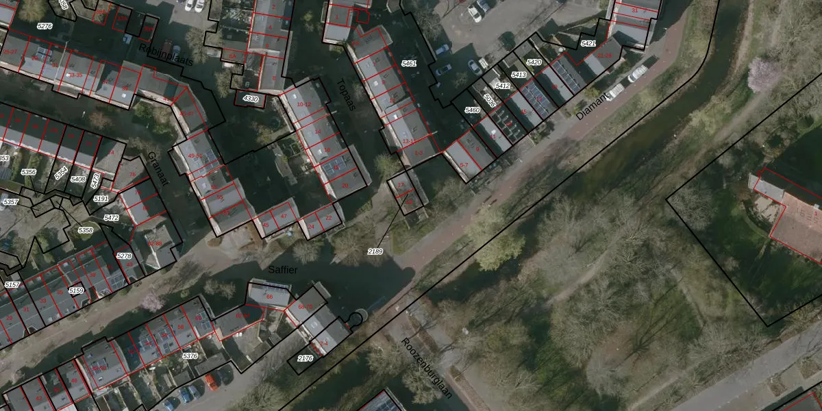 Het perceel waarop Topaas 19 staat heeft een oppervlakte van 50 m². Dit is een klein perceel. De perceeloppervlakte wordt geregistreerd door het Kadaster. Gedetailleerde informatie over de maten van dit perceel kunt u vinden in het rapport Kadastrale kaart met maatvoering van Topaas 19.