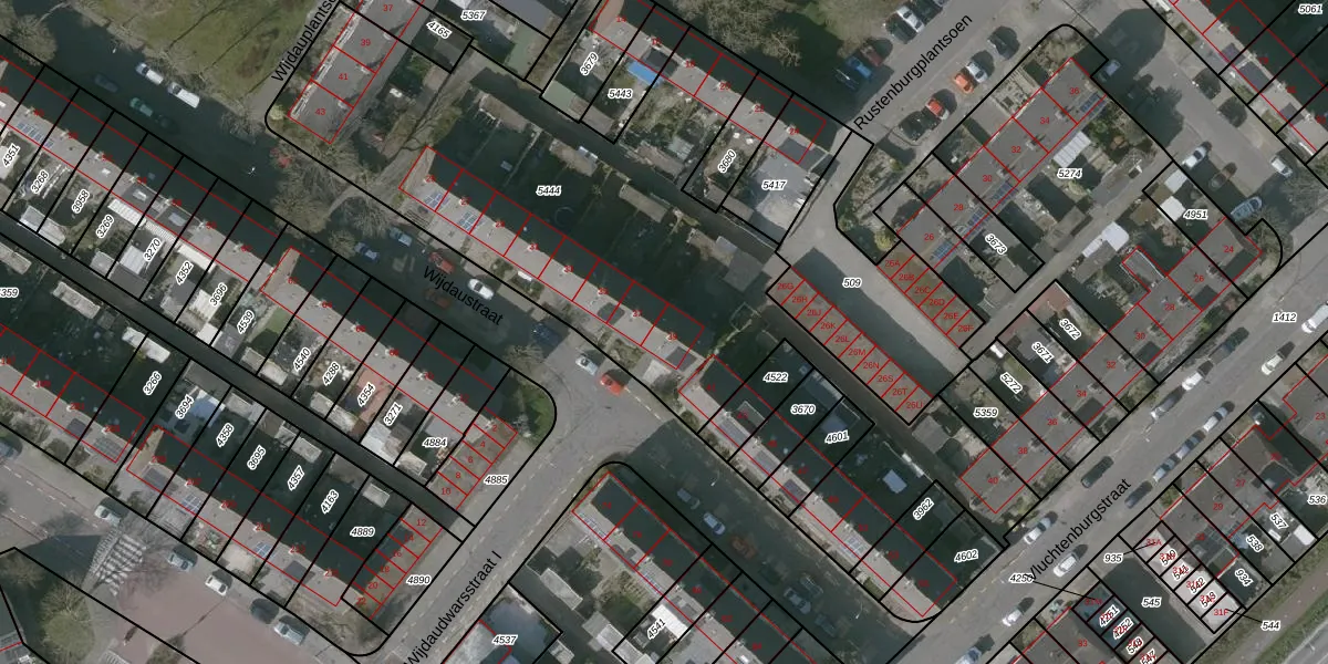 Het perceel waarop Wijdaustraat 39 staat heeft een oppervlakte van 2919 m². Dit is een zeer groot perceel. De perceeloppervlakte wordt geregistreerd door het Kadaster. Gedetailleerde informatie over de maten van dit perceel kunt u vinden in het rapport Kadastrale kaart met maatvoering van Wijdaustraat 39.
