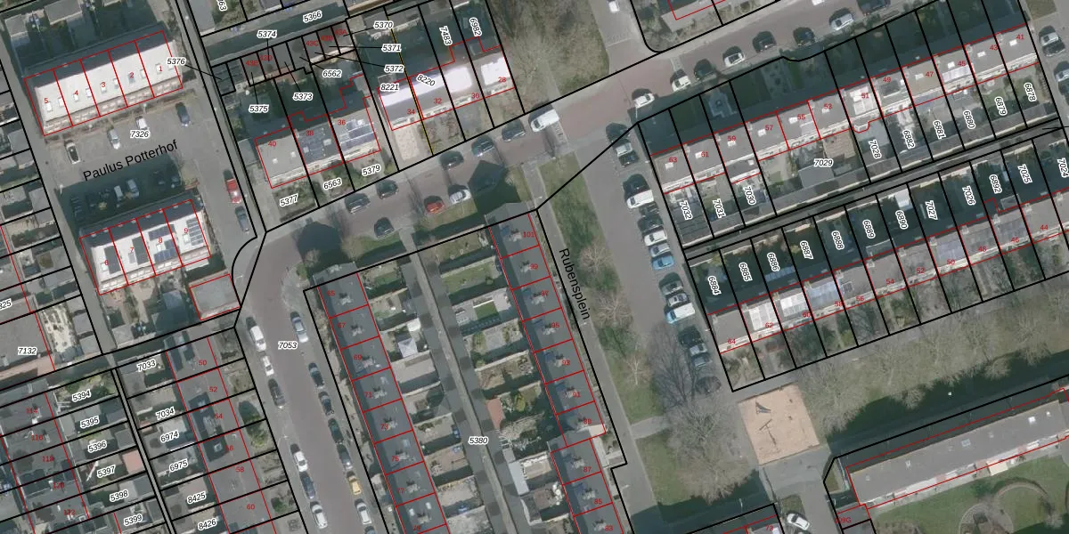 Het perceel waarop Rubensplein 99 staat heeft een oppervlakte van 3331 m². Dit is een zeer groot perceel. De perceeloppervlakte wordt geregistreerd door het Kadaster. Gedetailleerde informatie over de maten van dit perceel kunt u vinden in het rapport Kadastrale kaart met maatvoering van Rubensplein 99.