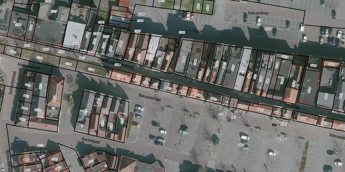 Het perceel waarop Westdijk 45 staat heeft een oppervlakte van 60 m². Dit is een klein perceel. De perceeloppervlakte wordt geregistreerd door het Kadaster. Gedetailleerde informatie over de maten van dit perceel kunt u vinden in het rapport Kadastrale kaart met maatvoering van Westdijk 45.
