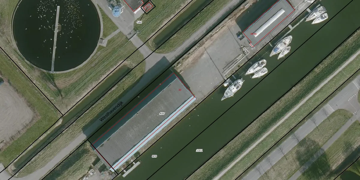 Het perceel waarop Westhavendijk 30 staat heeft een oppervlakte van 6090 m². Dit is een zeer groot perceel. De perceeloppervlakte wordt geregistreerd door het Kadaster. Gedetailleerde informatie over de maten van dit perceel kunt u vinden in het rapport Kadastrale kaart met maatvoering van Westhavendijk 30.