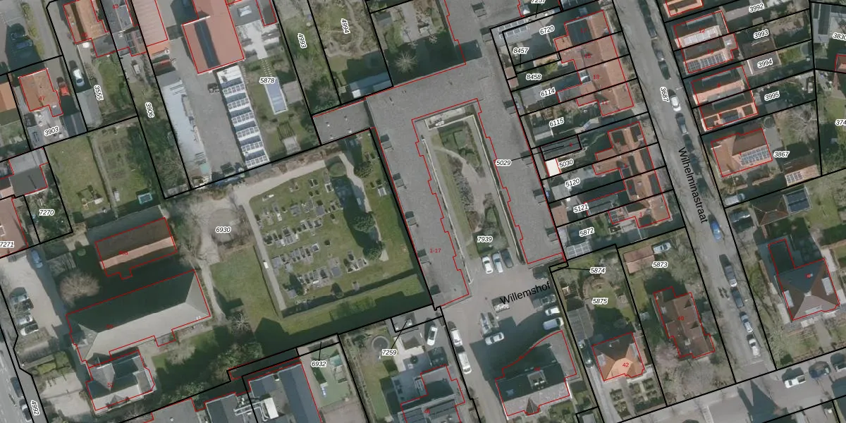 Het perceel waarop Willemshof 10 staat heeft een oppervlakte van 3624 m². Dit is een zeer groot perceel. De perceeloppervlakte wordt geregistreerd door het Kadaster. Gedetailleerde informatie over de maten van dit perceel kunt u vinden in het rapport Kadastrale kaart met maatvoering van Willemshof 10.