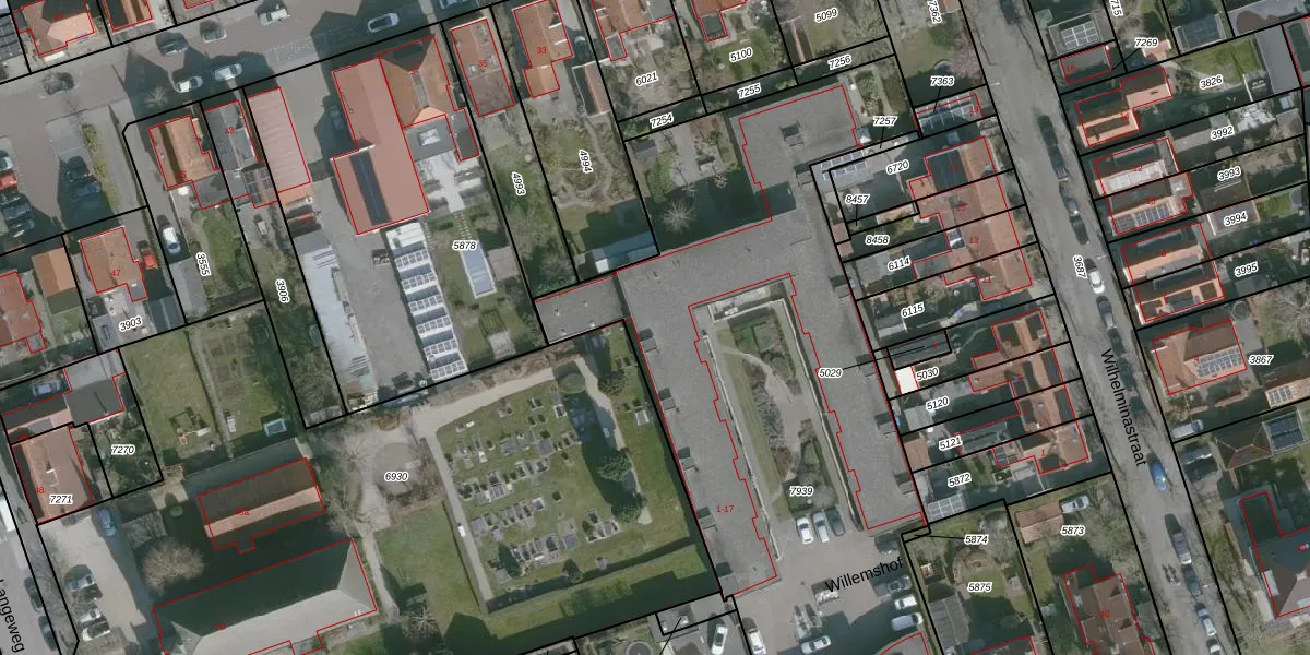 Het perceel waarop Willemshof 15 staat heeft een oppervlakte van 3624 m². Dit is een zeer groot perceel. De perceeloppervlakte wordt geregistreerd door het Kadaster. Gedetailleerde informatie over de maten van dit perceel kunt u vinden in het rapport Kadastrale kaart met maatvoering van Willemshof 15.