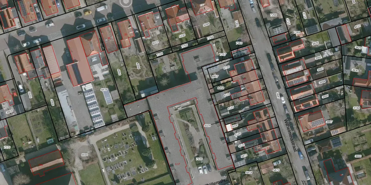 Het perceel waarop Willemshof 17 staat heeft een oppervlakte van 3624 m². Dit is een zeer groot perceel. De perceeloppervlakte wordt geregistreerd door het Kadaster. Gedetailleerde informatie over de maten van dit perceel kunt u vinden in het rapport Kadastrale kaart met maatvoering van Willemshof 17.