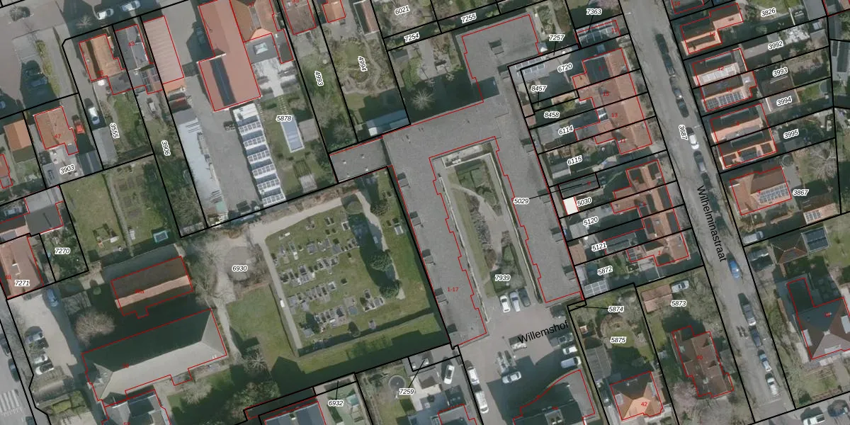 Het perceel waarop Willemshof 9 staat heeft een oppervlakte van 3624 m². Dit is een zeer groot perceel. De perceeloppervlakte wordt geregistreerd door het Kadaster. Gedetailleerde informatie over de maten van dit perceel kunt u vinden in het rapport Kadastrale kaart met maatvoering van Willemshof 9.