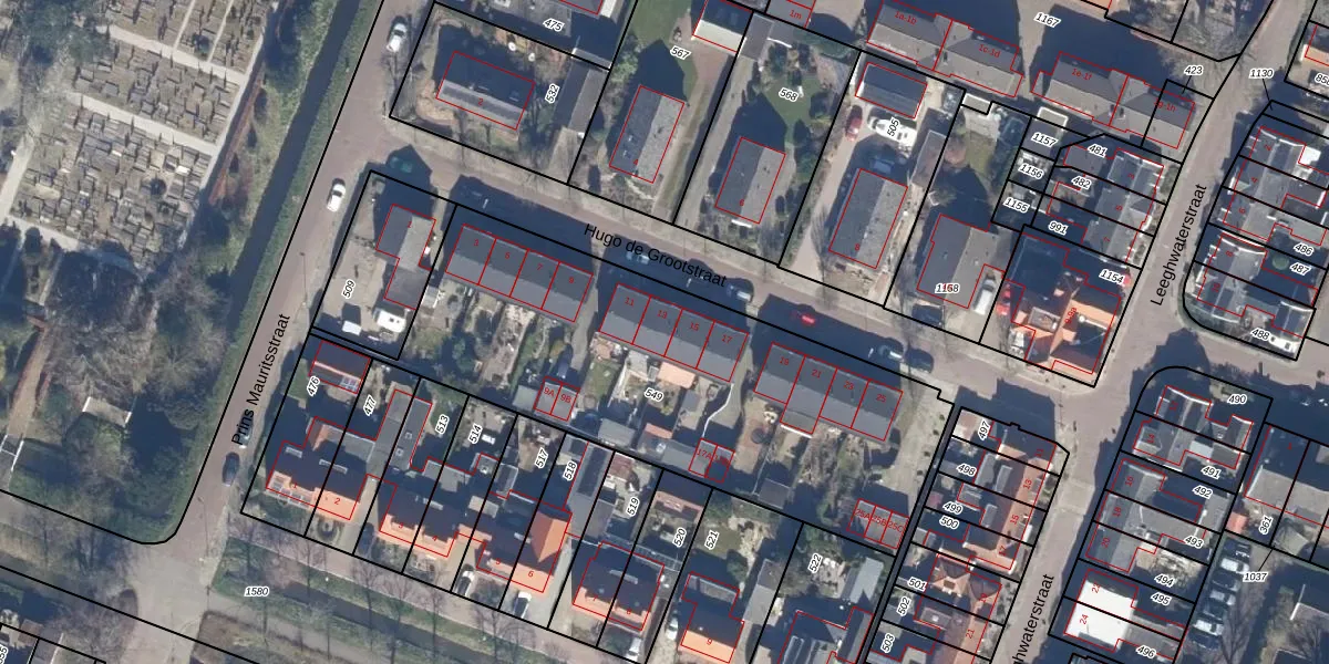 Het perceel waarop Hugo de Grootstraat 13 staat heeft een oppervlakte van 2106 m². Dit is een zeer groot perceel. De perceeloppervlakte wordt geregistreerd door het Kadaster. Gedetailleerde informatie over de maten van dit perceel kunt u vinden in het rapport Kadastrale kaart met maatvoering van Hugo de Grootstraat 13.